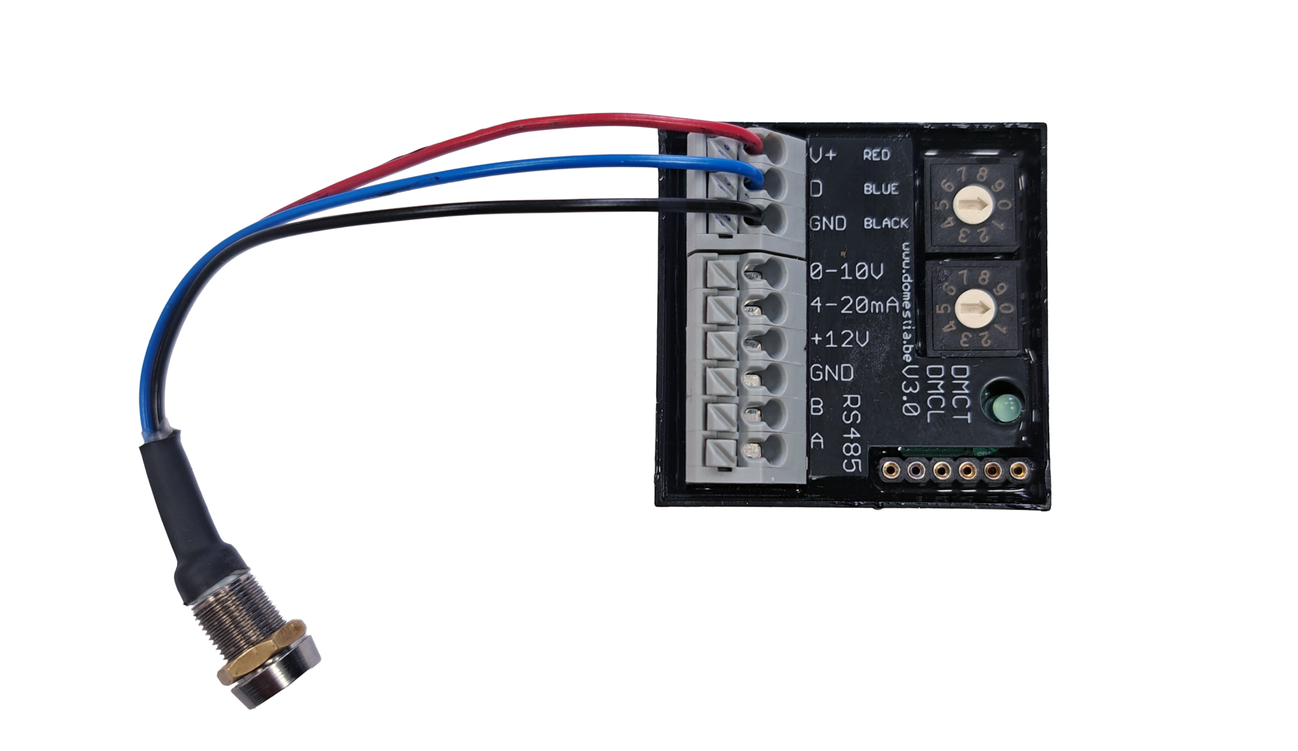 Le module DMCT-001-001 est un capteur de température: il est couplé à notre DME-LAN-002 par le bus de communication RS485 (ce module est fourni avec sonde de température).